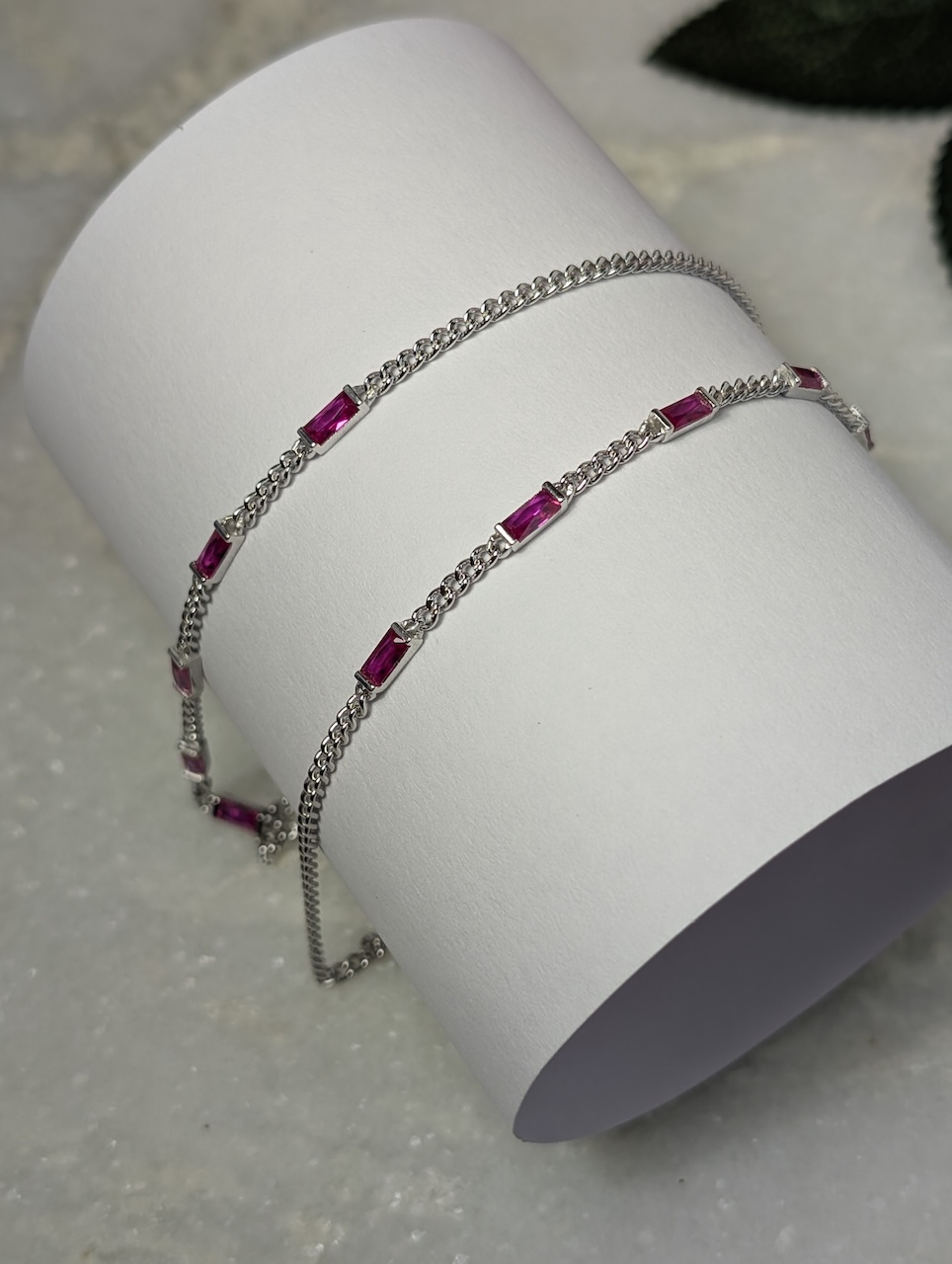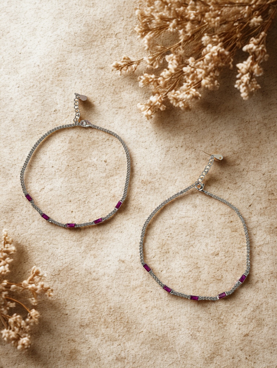 Elegant and vibrant, these 92.5 sterling silver anklets are adorned with striking ruby-pink baguette stones, adding a pop of color and sophistication to your steps. With a sleek silver polish and modern design, they perfectly balance traditional charm with contemporary style. Ideal for daily wear, festive occasions, or as a thoughtful gift.